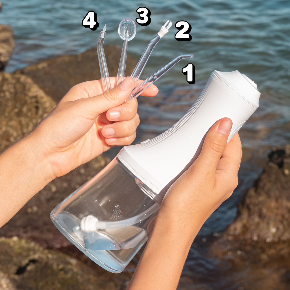 Fill the tank with lukewarm water, choose your preferred nozzle, and lean over the sink before turning it on. Aim the jet between your teeth and along the gumline, moving slowly for a thorough clean.